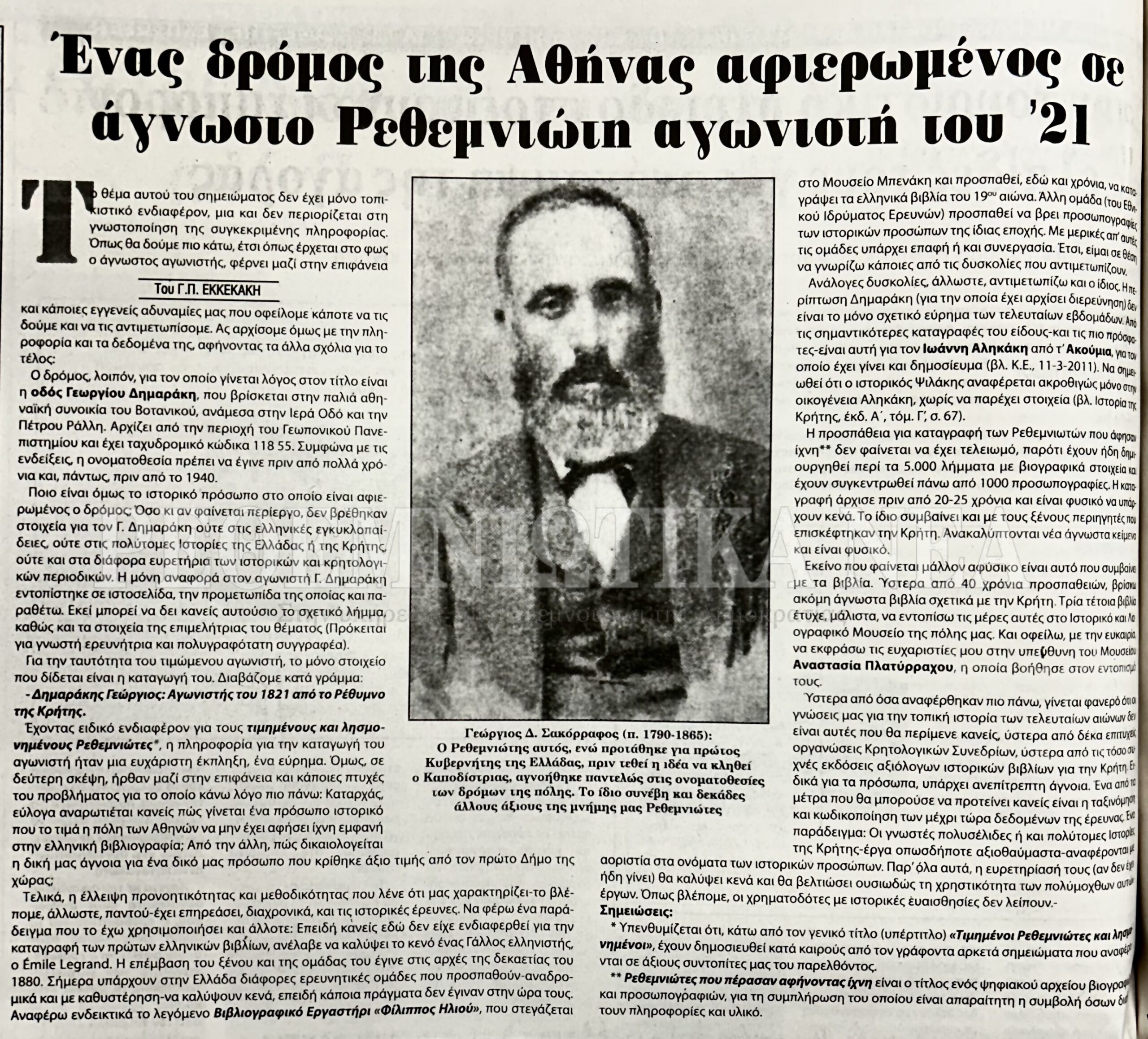 Ένας δρόµος της Αθήνας αφιερωµένος σε άγνωστο ρεθεµνιώτη αγωνιστή του ’21 05 / 08 / 2025 «Ένας δρόµος της Αθήνας αφιερωµένος σε άγνωστο ρεθεµνιώτη αγωνιστή του ’21» του Γιώργου Π. Εκκεκάκη, εφηµ. Ρεθεµνιώτικα Νέα, 28 Απριλίου 2011. Αφήστε μια απάντηση Πατήστε εδώ για να ακυρώσετε το σχόλιο. Όνομα (απαιτούμενο) E-mail (δεν θα δημοσιευθεί) (απαιτούμενο) Website Σχόλιο