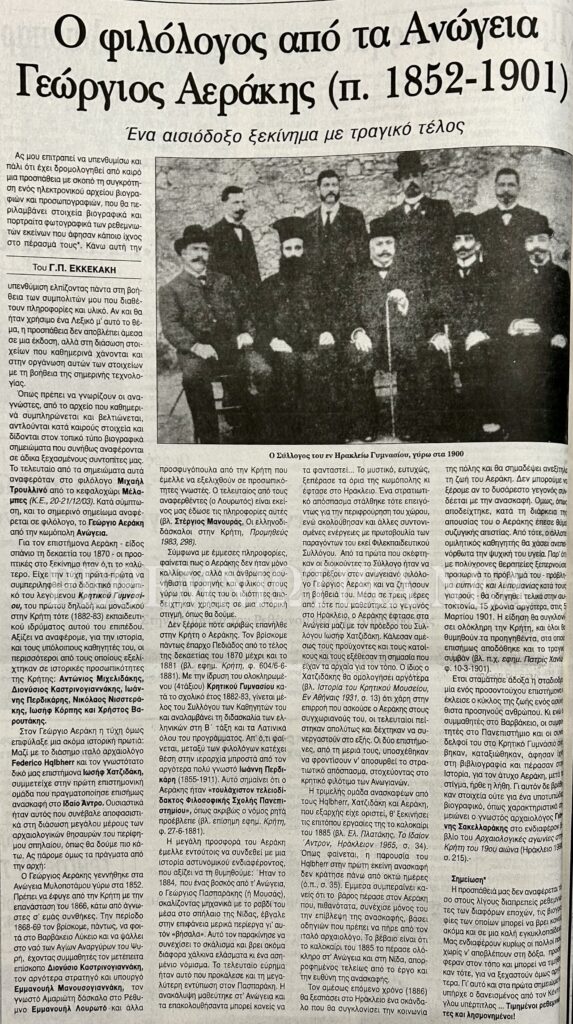 «Ο φιλόλογος από τα Ανώγεια Γεώργιος Αεράκης (π. 1852-1901). Ένα αισιόδοξο ξεκίνηµα µε τραγικό τέλος» του Γιώργου Π. Εκκεκάκη, εφηµ. Ρεθεµνιώτικα Νέα, 13 Ιανουαρίου 2004.